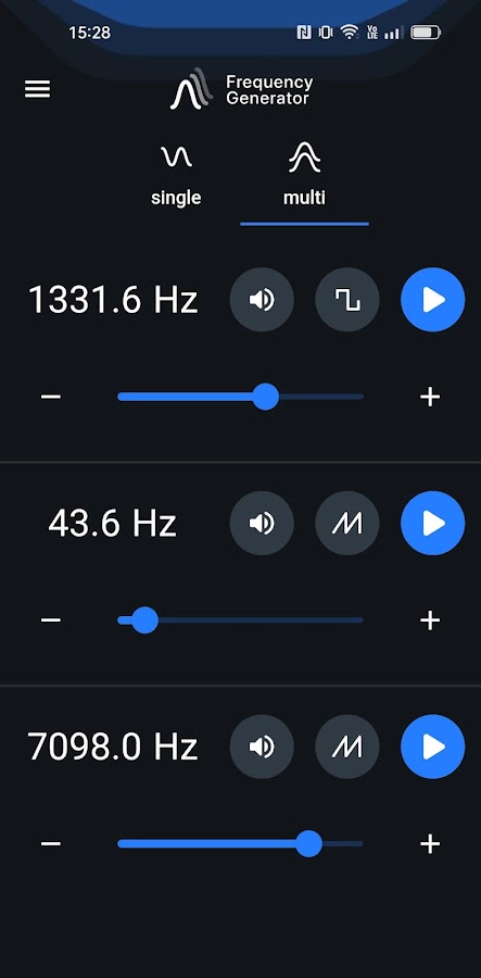 В этом режиме вы можете генерировать за один раз три звука. Установите разные частоты, волны и громкость.
