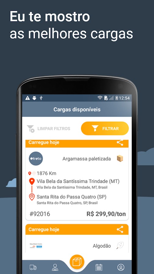 Водитель грузовика, я Фрето. Приложение для грузоперевозок, где вы можете найти отличные грузы от самых надежных грузоотправителей со всей Бразилии. Вот со мной, у вас есть список мощных грузов, которые вы можете нести, когда и где хотите. Все это с моей компанией и без бюрократии.