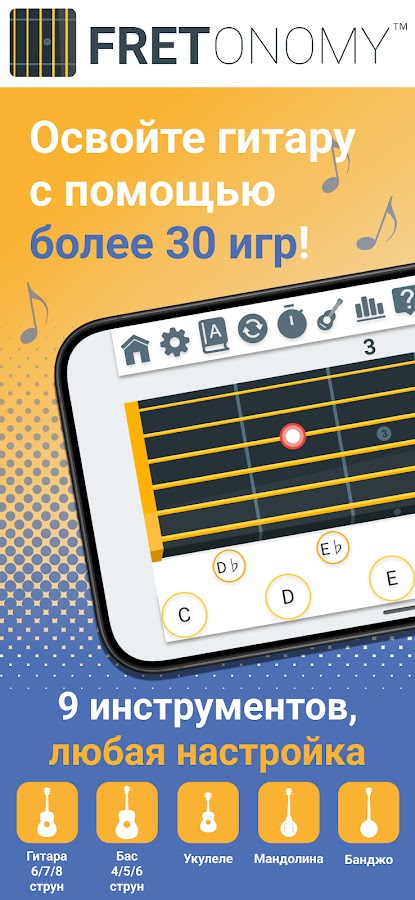 Fretonomy — это наилучшая обучающая игра для изучения нот и аккордов на грифе гитары и других струнных инструментах.