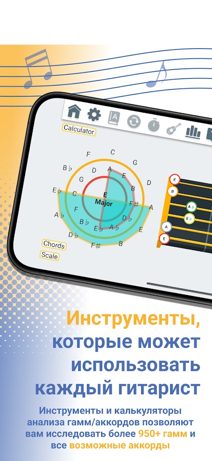 Исследуйте гаммы на грифе Вашего инструмента с игрой Исследователь гамм. Выберите основной тон и одну из 63 различных гамм и начните запоминать Ваши гаммы. Меняйте цвета нот на грифе, чтобы быстрее определять интервалы.