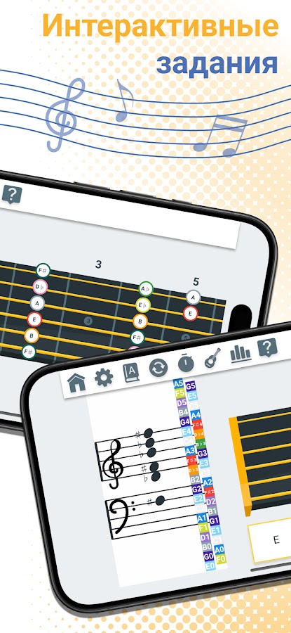 Или изучайте лады на грифе и ноты на нотном стане одновременно с игрой Нотный стан и гриф. Выбирайте лады на грифе, которые соответствуют нотам на нотном стане!