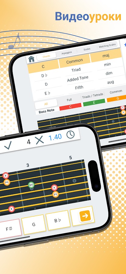 Выберите ваш музыкальный инструмент и одну из многих доступных вам игр для репетиции грифа, пока не овладеете каждым ладом и сочетанием аккордов.