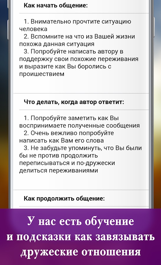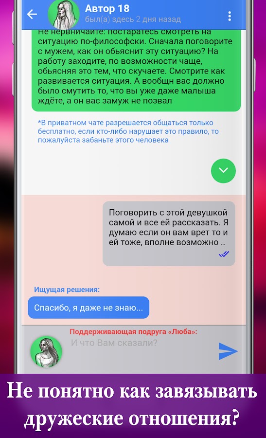Вокруг нас много предательств, лжи и обмана. Мы порой не замечаем как сами постепенно переступаем черту… Но для долгосрочный отношений нужно доверие и готовность рисковать перед другим человеком. Это не легко. Но этому можно научиться. Для начала нужно самому научиться понимать собеседника, а для этого во первых его внимательно выслушать и вспомнить как это было у себя. После этого осмелиться и рассказать свою историю переживания. И быть готовым принять реакцию и ответ другого. И только так продолжать общение. Для этого требуется много смелости, социальных навыков и терпения. Именно у нас в приложении Вы можете пробовать давать поддержку и учиться выстраивать дружеское общение, которое поможет Вам в Вашей личной жизни и не только.