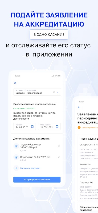 Мобильное приложение позволит сформировать заявление на аккредитацию, включая образовательную и профессиональную части портфолио, загрузить подтверждающие документы, своевременно отследить статусы согласования портфолио и заявлений.