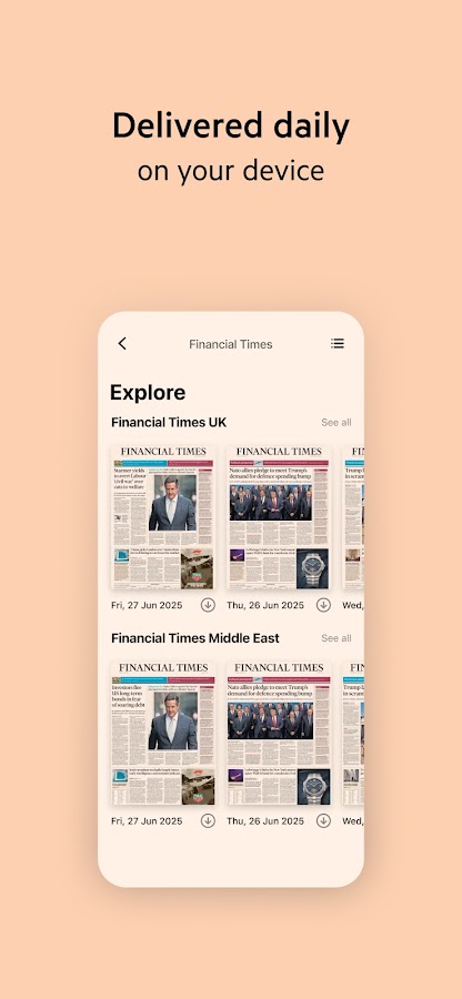 Ваша ежедневная газета Financial Times, которая будет доставлена на ваше устройство сразу после выхода в печать.