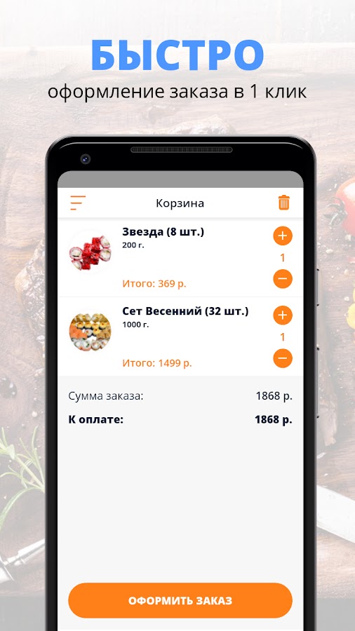 Скачивайте наше приложение, оформляйте заказ и наслаждайтесь любимой едой, где бы Вы ни были! Приятного аппетита!