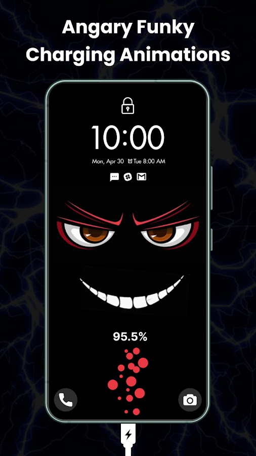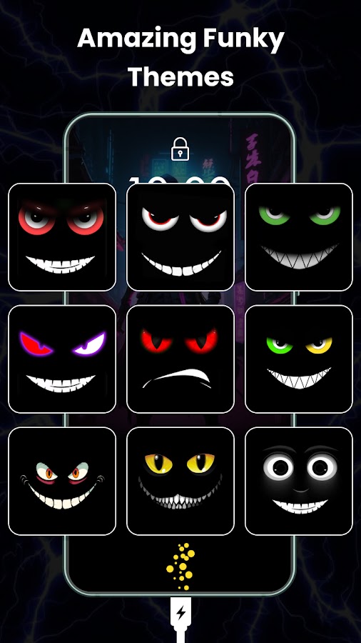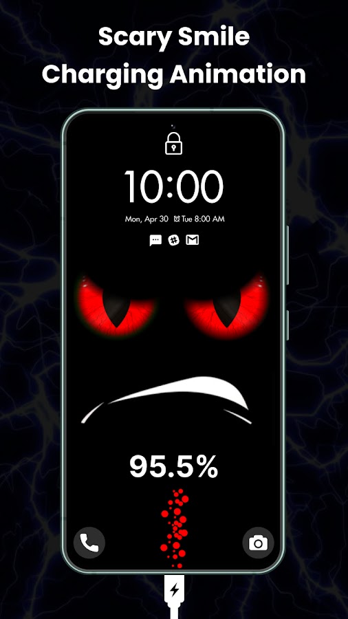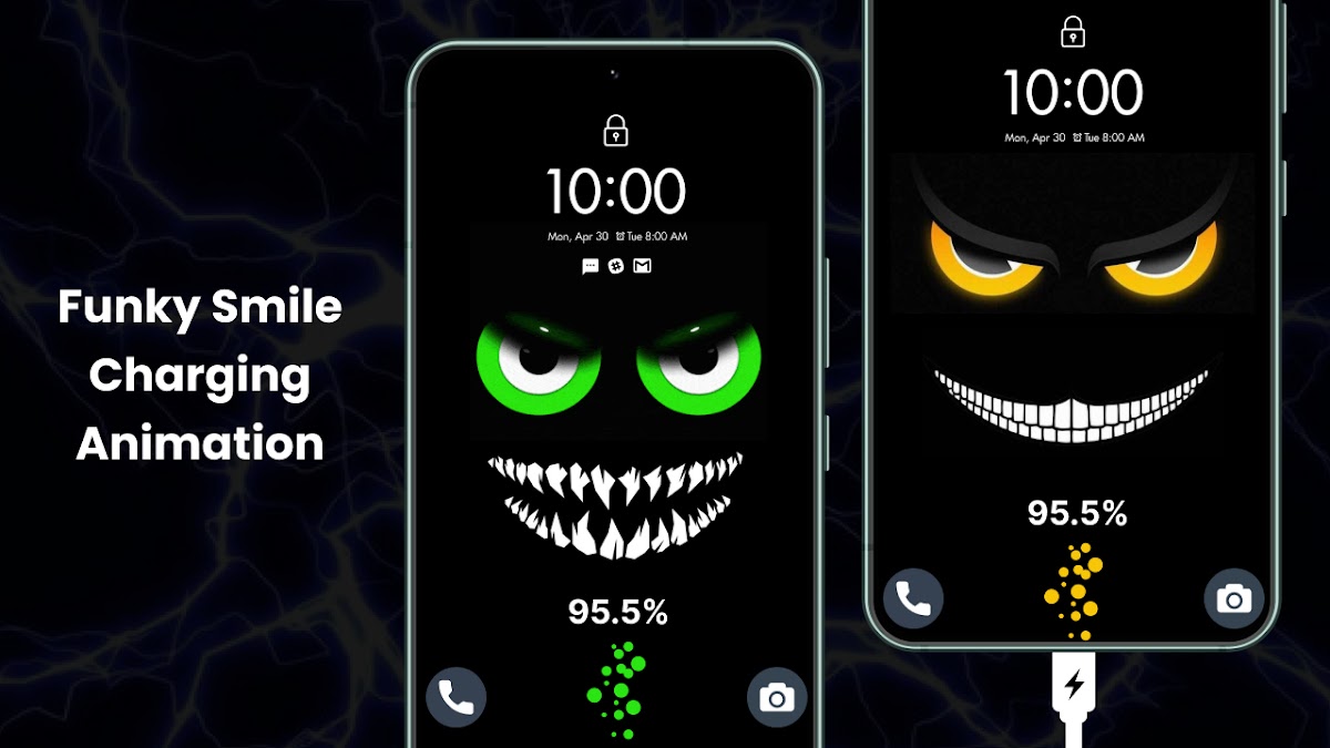 С помощью обоев с глупой улыбкой и зарядкой вы увидите забавные лица, которые заставят вас смеяться каждый раз, когда вы подключаете зарядное устройство к телефону. В наших жутких анимациях зарядки аккумулятора присутствуют загадочные улыбки, которые придают вашему устройству необычный вид. Обои с живой злой улыбкой, заряжающей обои, демонстрируют огненные выражения, которые заставляют ваш экран выглядеть устрашающе.