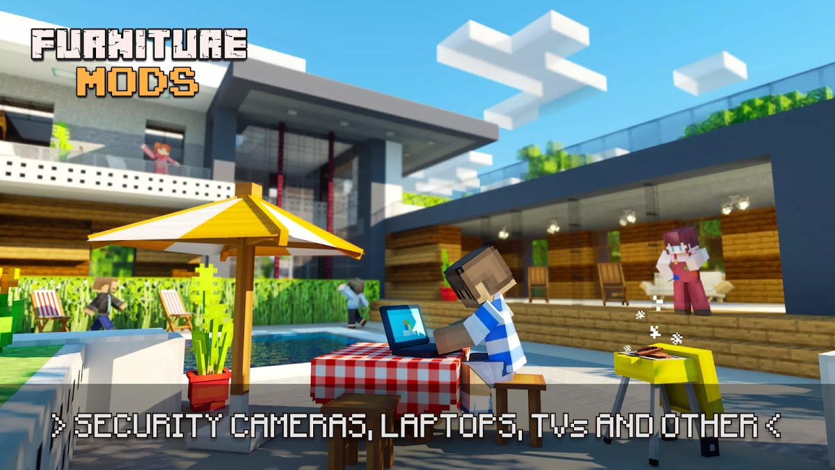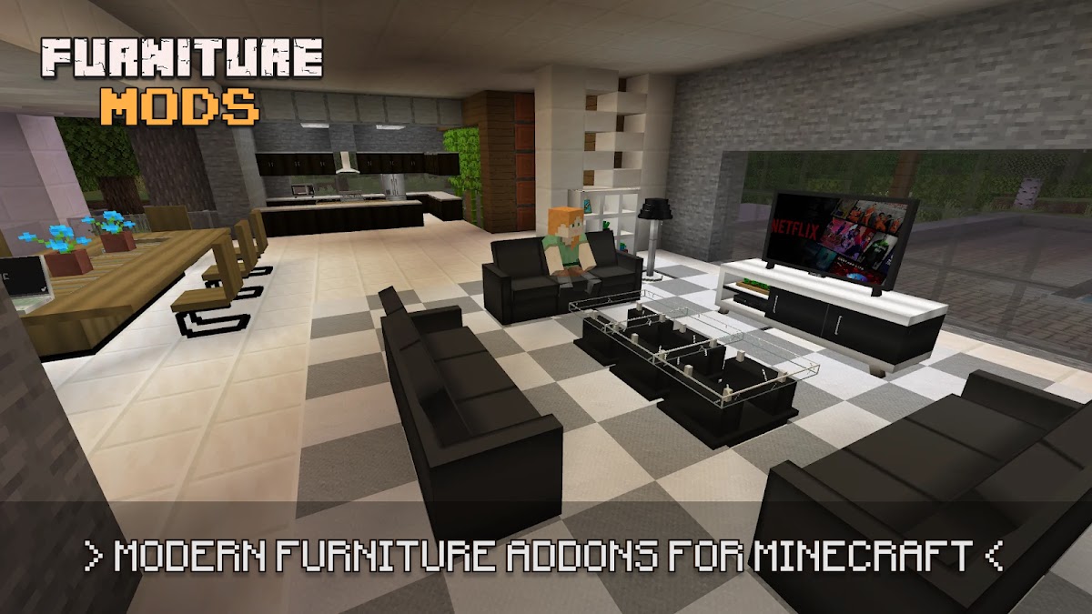 ✅ Включает в себя функциональные элементы интерьера, такие как телевизор, ноутбук, диваны, кушетки, лампы и другую современную мебель для Minecraft pe;
