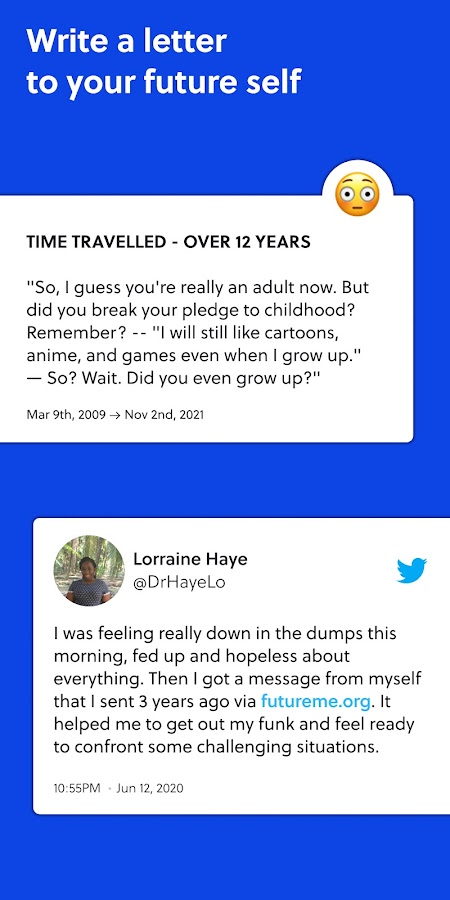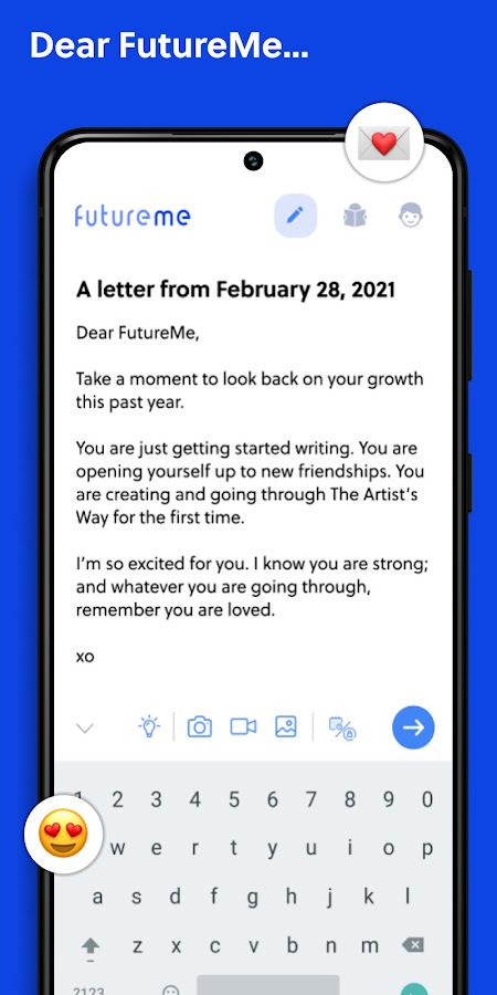 Приложение FutureMe позволяет вам писать, планировать и отправлять письма себе, друзьям и членам семьи в будущем — и быть уверенным, что они будут доставлены вовремя!