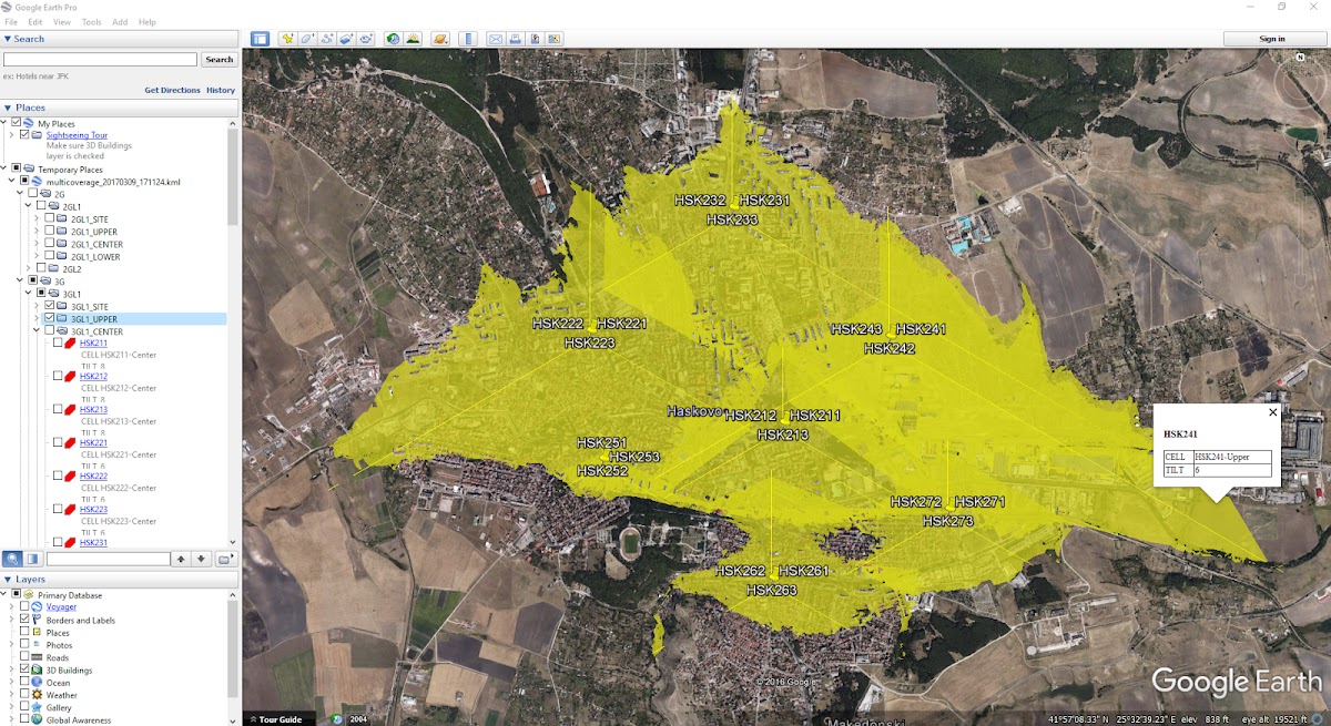— покрытие нескольких ячеек — экспорт нескольких ячеек в KML — KML организован на уровне технологии и ячейки.
