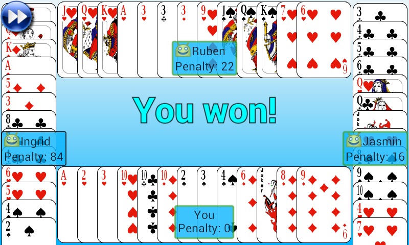 Цель проста: как можно скорее избавиться от штрафных очков. Вы можете сделать это путем сбора серий (не менее трех последовательных карт одной масти) или наборов (три или четыре одинаковые карты разных мастей). Но вам нужно не менее двух серий перед тем, как начнется подсчет очков. И одна из серий должна быть без джокера!