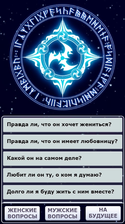 Гадание стало еще проще. Выбираете вопрос и вскоре предсказатель даст вам верный ответ на интересующую тему. Приложение содержит много вопросов на темы любви и отношений, детей и замужества, богатства и долголетия. Вы сможете узнать кто родится и погадать на будущее ваших отношений.