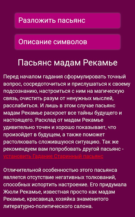 Скачайте приложение Гадание: пасьянс Рекамье для Android бесплатно - последняя версия (2.0) уже доступна для установки на ваш телефон или планшет.