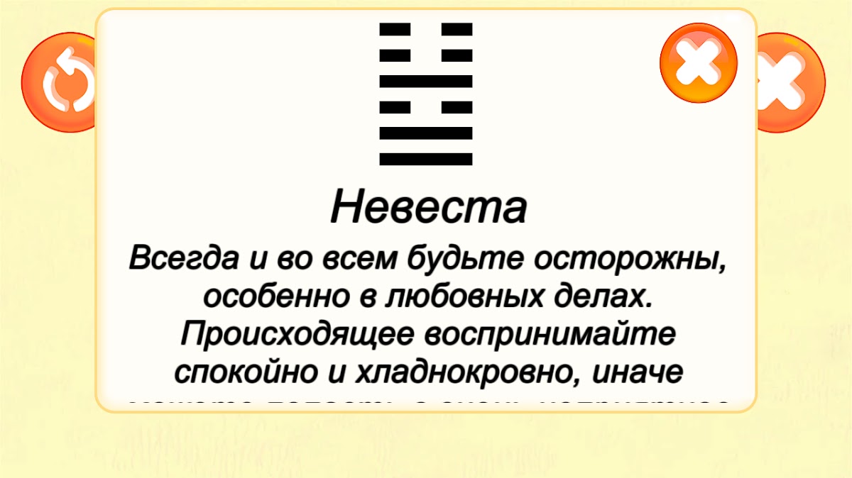 Гадание по книге перемен – одно из самых древних гаданий. Возникло это гадание в древнем Китае. Древние китайцы, как и все древние люди, наблюдали за природой, пытались постичь тайный смысл жизни и Вселенной. Они поняли, что единственно верный путь для человека – это гармония с самим собой и природой. Накопленные ими знания и мудрость были изложены в «Книге перемен» — «И цзин». «Книга перемен» представляет собой 64 гексаграммы и их толкования. Каждая гексаграмма состоит из 6 линий. Энергия Инь – женское начало – обозначается в виде двух маленьких последовательных линий. Энергия Ян – мужское начало – записывается как одна длинная линия. В древности гадали с помощью стеблей тысячелистника, но теперь, в основном, используются монетки. Гадание на стеблях тысячелистника было более точным, однако на монетах гадать проще. В этом великолепном приложении, вам представляется уникальная возможность, узнать свою судьбу при помощи данной методики!