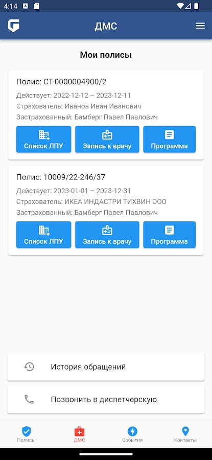 — просмотр информации о заявленных страховых случаях;