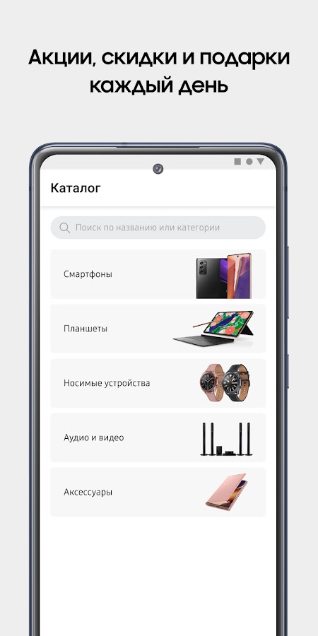 Флагманские смартфоны Samsung Galaxy S и Galaxy Z, огромное семейство смартфонов Samsung Galaxy A и планшеты Samsung Galaxy Tab, наушники Galaxy Buds и смарт-часы Galaxy Watch, новейшие модели 4K и 8K телевизоров, проекторы, акустика, внешние накопители и аккумуляторы — все здесь, под рукой, в приложении Galaxystore.