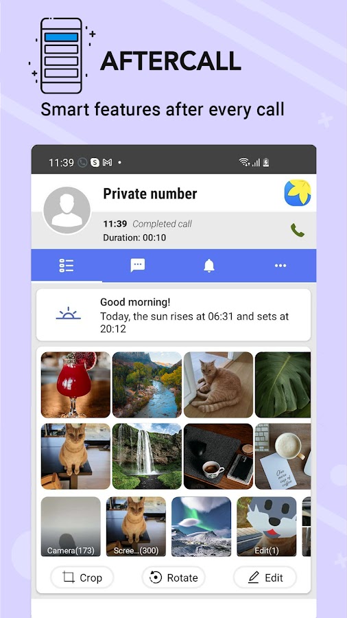 Приложение «Галерея» включает функцию «после звонка», которая позволяет быстро обрезать, поворачивать и редактировать изображения, отправлять ответы и устанавливать напоминания прямо с экрана «после звонка».