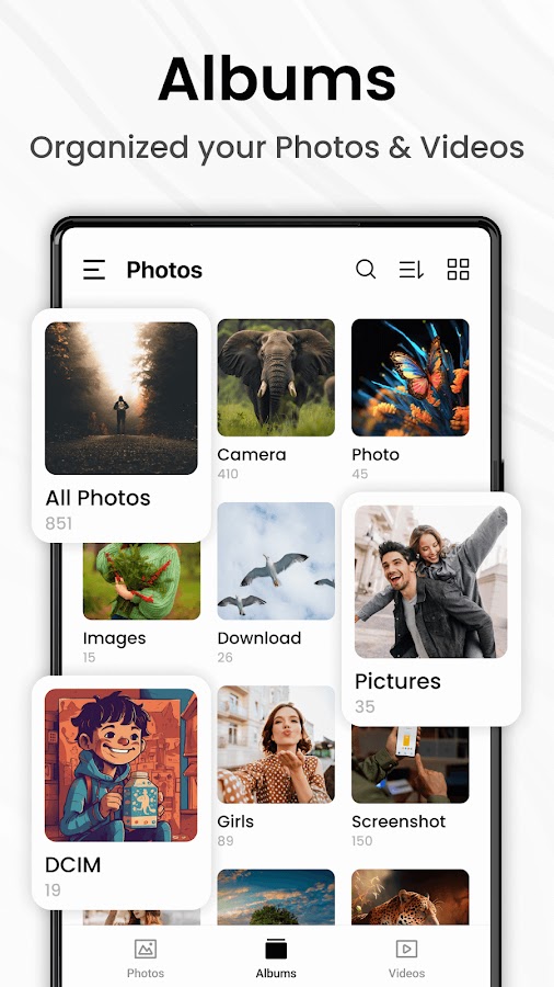 * Автоматически идентифицировать и систематизировать все фотографии и видеофайлы на вашем телефоне.