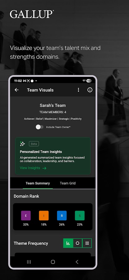 — Понимайте динамику команды с помощью таблиц, сводок и аналитики о совместной работе CliftonStrengths. — Получайте персонализированную аналитику команды, созданную с помощью ИИ, о командной работе, лидерстве и потенциальных барьерах.
