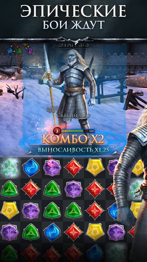 Заряжайте и используйте уникальные мощные способности чемпионов, соединяя камни. Стратегически меняйте команду, снаряжая героев смертоносным оружием или легендарными личными предметами. Дайте Джону Сноу Длинный Коготь, а Арье Иглу, чтобы победить врагов и переломить ход битвы.
