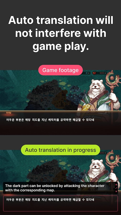 Автоматический перевод: После включения автоматического перевода вам больше не нужно ничего делать, Игровой Переводчик Мастер автоматически переведет текст в заранее выбранной области (обычно как выбор используется диалоговое окно игры). Вы можете в любое время начать или приостановить автоматический перевод.