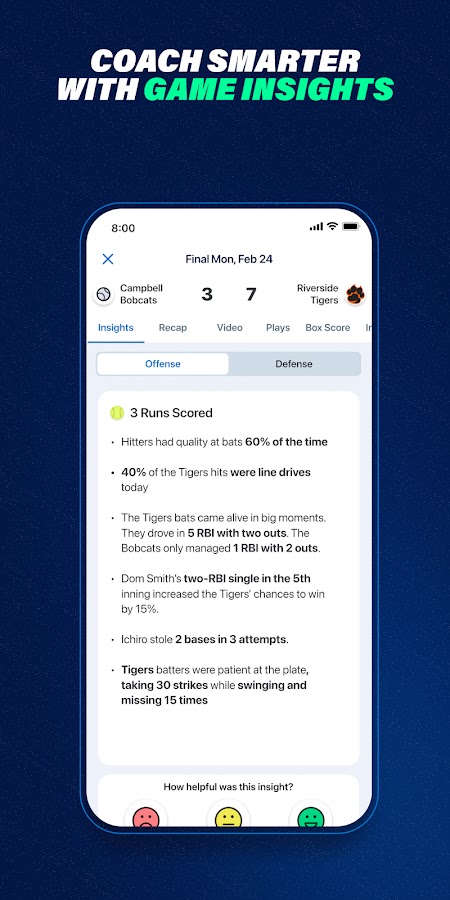 Тренеры получают четкую и понятную информацию об атаке и защите в каждой игре по бейсболу и софтболу, которая помогает формировать планы тренировок и игровую стратегию.