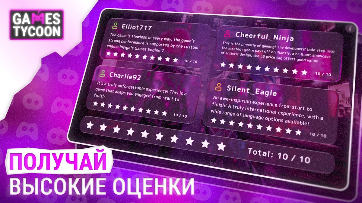 Ваши хитовые проекты получают престижные награды, что повышает репутацию студии и открывает доступ к дополнительному финансированию и эксклюзивным исследованиям. Побеждайте в конкурсах и становитесь лидером рынка.