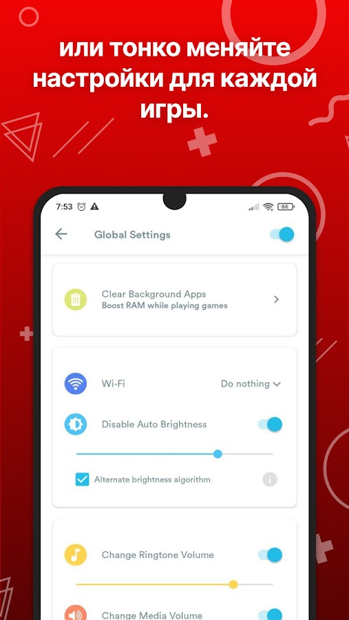 Вы можете задать разные настройки, которые будут применены автоматически, когда начнется игра, это опция называется игровой режим. Эти настройки можно сделать глобальными или только отдельно для одной игры, применяйте “взлом игр”, улучшайте игровой процесс.