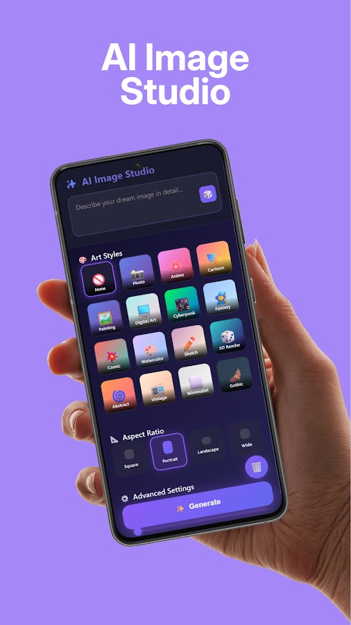 16 художественных стилей: Профессиональный, Аниме, Мультяшный, Акварель, 3D-рендер и другие