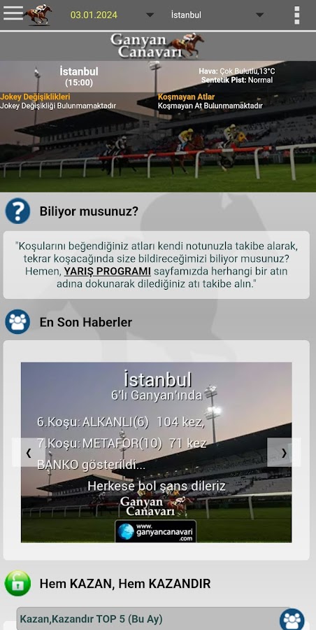Скачайте приложение Ganyan Canavarı — At Yarışları для Android бесплатно - последняя версия (4.0.15) уже доступна для установки на ваш телефон или планшет.
