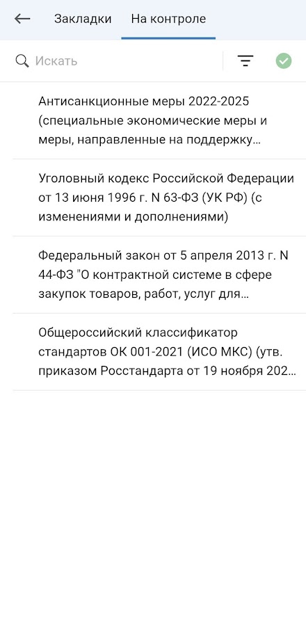 — Контролировать значимые для Вас правовые события. Приложение проинформирует Вас о появлении новой редакции закона, вступлении в силу, прекращении действия документа и других событиях.