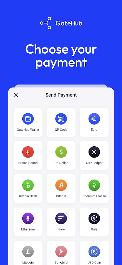 Ripple (XRP), Биткойн (BTC), Bitcoin Cash (BCH), Эфир (ETH), Ether Classic (ETC), Dash (DASH), Litecoin (LTC), Flare (FLR), Songbird (SGB), USD Coin ( USDC), Tether (USDT), Gala (GALA), Wrapped XRP (WXRP) и сотни других криптоактивов.