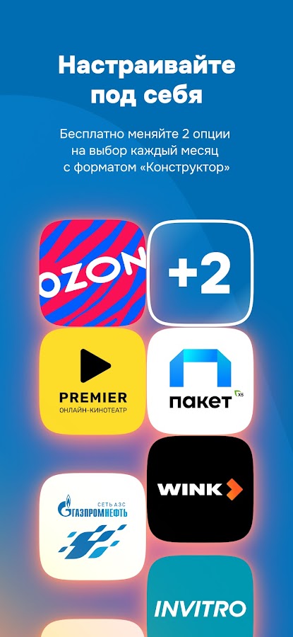 4 базовых сервиса на каждый день: 2 онлайн-кинотеатра, премиум-условия на Ozon, кешбэк и бесплатные доставки из супермаркетов с сервисом«Пакет». Добавляйте к ним 2 опции на выбор из списка — например, VK Музыка без рекламы или скидки в РИВ ГОШ и Lamoda — и меняйте хоть каждый месяц.