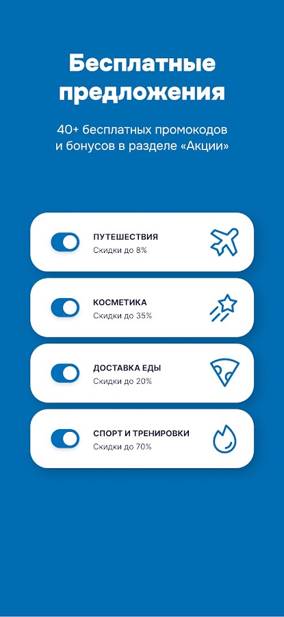 Для всех зарегистрированных пользователей 40+ бесплатных промокодов в разделе «Акции»: доставка еды, заказ продуктов, бронирование отелей и многое другое.