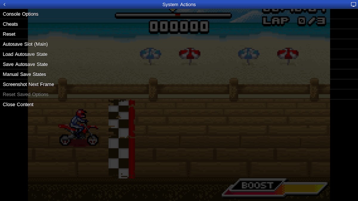 Игра для гонок на мотоциклах Motocross Challenge предоставлена разработчиком Дэвидом Дусе. Никакие другие ПЗУ не включены в это приложение и должны быть предоставлены пользователем. Поддерживает фреймворк доступа к хранилищу Android для открытия файлов как на внутреннем, так и на внешнем накопителе (SD-карты, USB-накопители и т. д.)