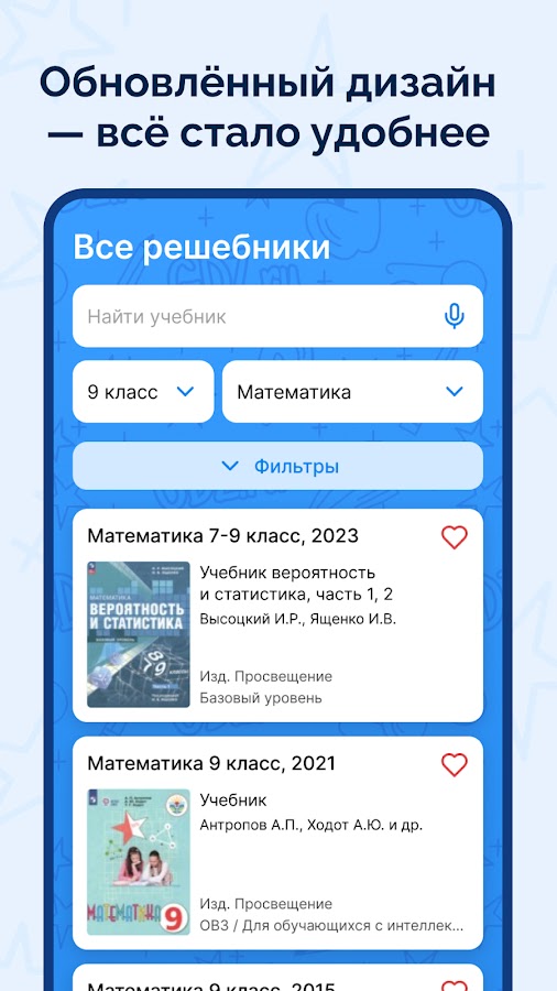 В приложении есть решения для учебников всех популярных авторов. Неважно, по какому учебнику ты учишься: Виленкин или Петерсон по математике, Ладыженская или Разумовская по русскому, Биболетова или Ваулин по английскому, Перышкин по физике или Габриелян по химии — мы поможем со всеми. Наш каталог включает более 50 авторов, включая Моро, Мерзляк, Атанасян, Афанасьева, Макарычев, Боголюбов, Мединский, Коровина, Арсентьев, Баранова, Тороп, Алексеев, Пасечник, Босова, Бим, Смирнов, Плешаков, Высоцкий, Алимов, Бунимович, Лукашик, Рудзитис, Юдовская и многих других.