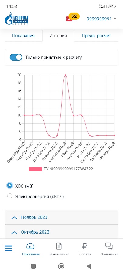 2) на странице «Показания» для передачи показаний выберите нужный прибор учета, введите показания и нажмите «Передать показания» (прием показаний осуществляется с 1 по 25 число месяца). По каждому прибору учета Вы можете ознакомиться с графиком потребления ресурсов за интересующий период в подразделе «История показаний». В подразделе «Предварительный расчет» доступна функция расчета суммы к оплате до выставления платежного документа;