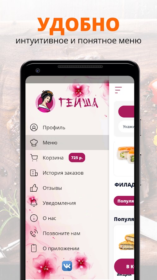 Приложение Гейша | Красноярск — это удобный способ заказа еды домой или в офис. Всегда в нашем меню — вкусные роллы, суши, салаты и многое другое.