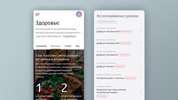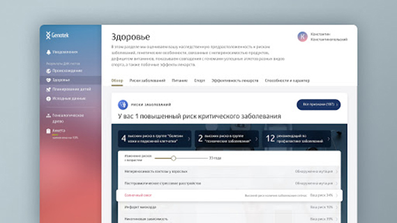 В этом разделе мы оцениваем вашу наследственную предрасположенность к риску заболеваний, генетические особенности, связанные с непереносимостью продуктов, дефицитом витаминов, по выявлению совпадений с геномами успешных атлетов разных видов спорта, а также достижение результатов лекарств. Раздел включает в себя 6 тематических ДНК-тестов:
