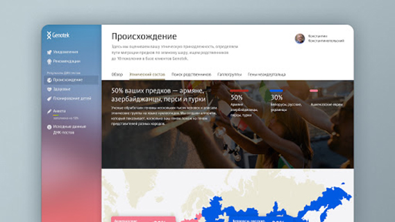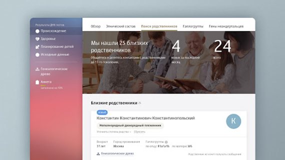 В этом разделе мы оцениваем вашу этническую статистику, обнаруживаем пути выявления предков по земному шару, ищем родственников до 10 поколений в базе клиентов Genotek. Раздел включает в себя 4 тематических блока: