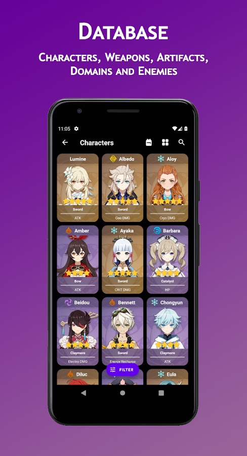 • База данных персонажей, оружия, артефактов, доменов и врагов