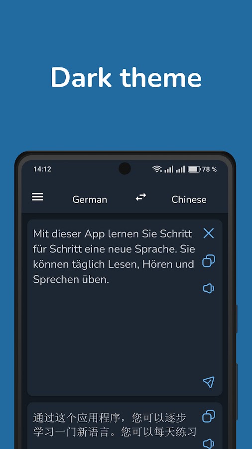 Переводчик с немецкого на китайский — быстро, конфиденциально, офлайн. Теперь с темным режимом!