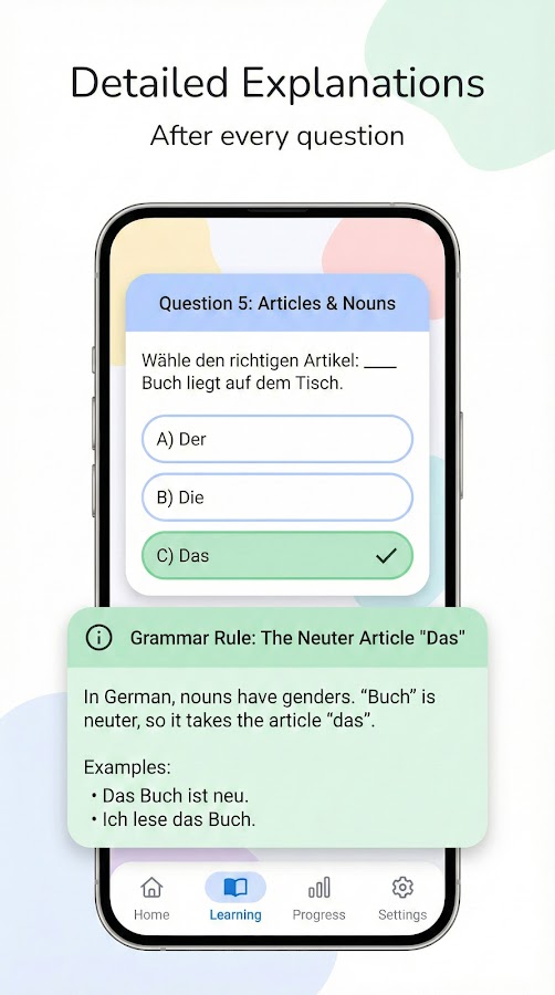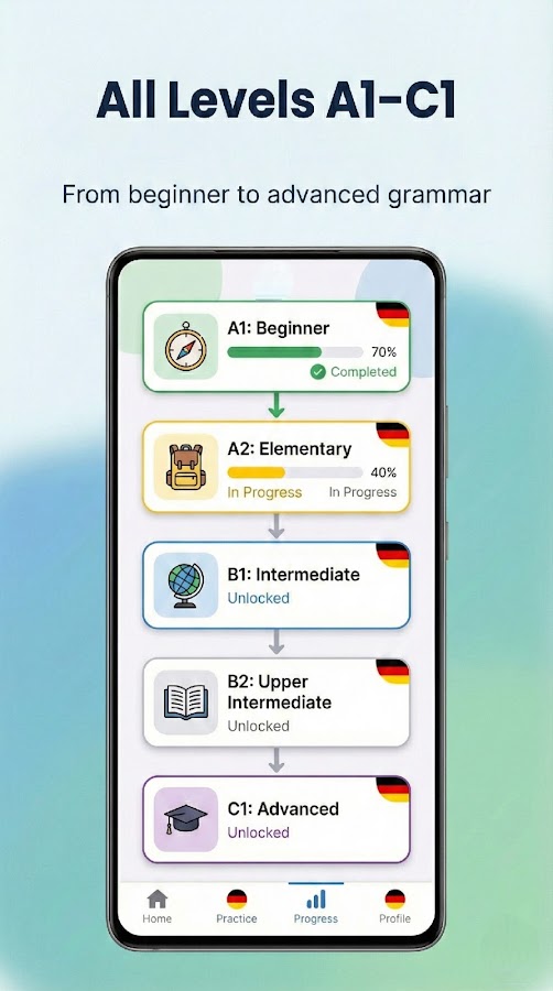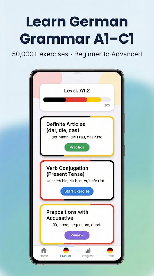 Это полноценное приложение поможет вам пошагово практиковать грамматику от A1 начинающего до C1 продвинутого, с более чем 50.000 грамматическими упражнениями (Deutsch Übungen) – всё бесплатно и доступно офлайн.