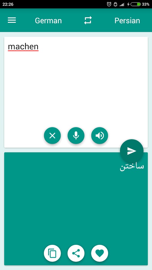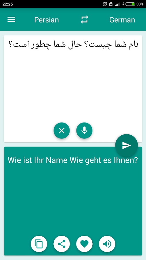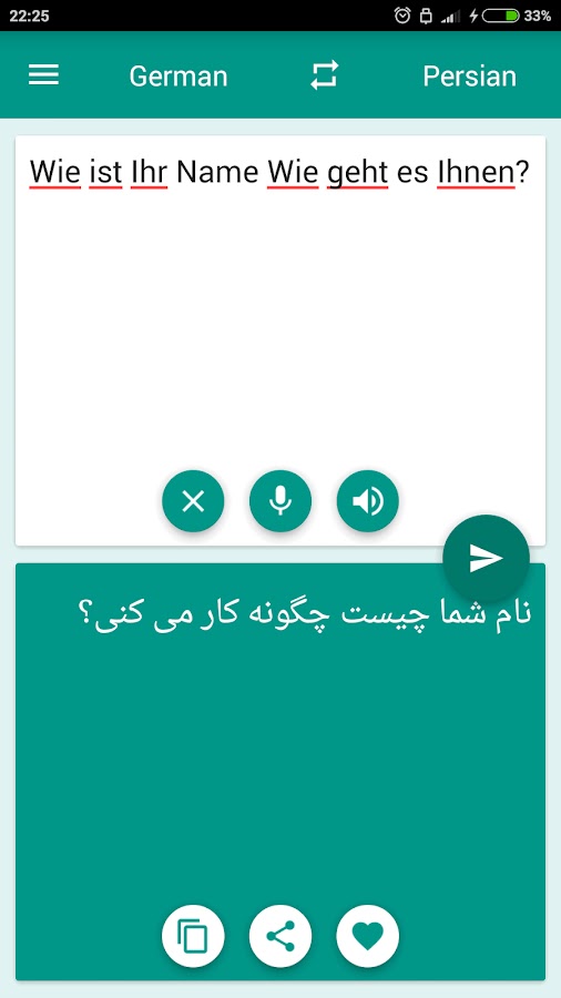 Этот бесплатный переводчик может быстро переводить с немецкого на персидский и с персидского на немецкий. Слова, а также полные предложения. Мгновенный перевод и полная достоверность слов.