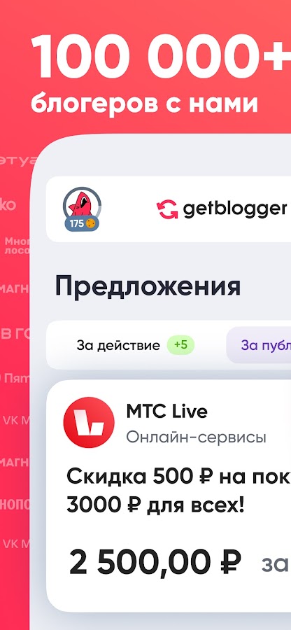 Сотни эксклюзивных предложений от лучших рекламодателей России ждут тебя на Getblogger. Зарабатывай на любимом деле без посредников и комиссий с помощью удобного мобильного приложения.