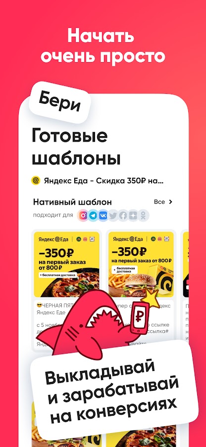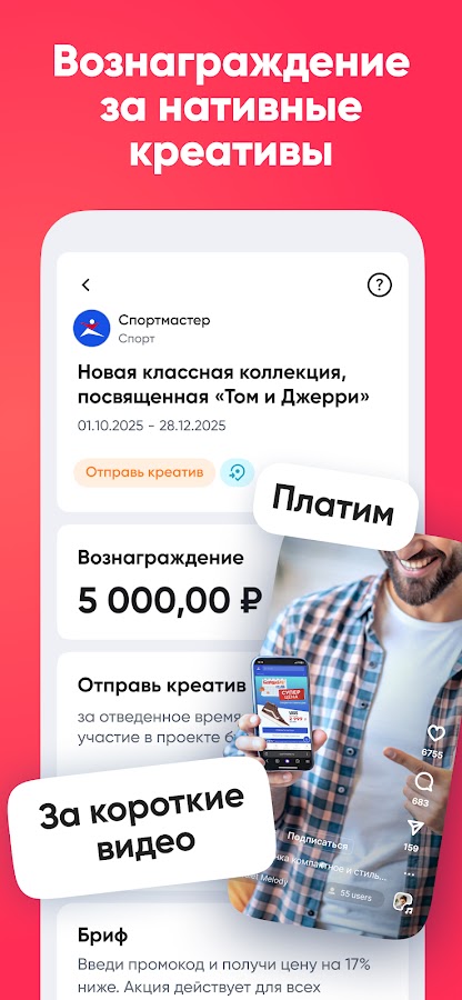 Выбирай наиболее интересные твоим подписчикам рекламные предложения с оплатой за целевые действия, получай персональные промокод и рекламную ссылку и зарабатывай на их применениях твоими подписчиками. Или выбирай предложения с фиксированной оплатой за публикацию и монетизируй свою креативность.