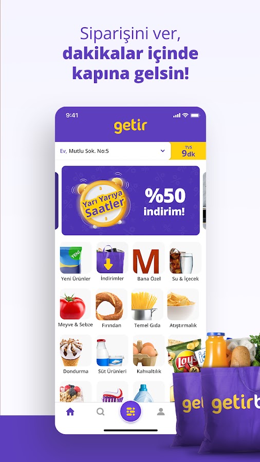 Getir всегда к вашим услугам для онлайн-покупок продуктов, заказов еды и финансовых транзакций! Благодаря тысячам вариантов вы можете получить ежедневные покупки, продукты и заказы еды с доставкой на дом за считанные минуты, вызвать такси и даже воспользоваться нашими финансовыми услугами.