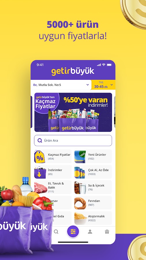 Тысячи товаров из всех категорий ждут вас с GetirBüyük. Теперь вы можете покупать продукты онлайн, а курьеры GetirBüyük доставят ваши покупки прямо к вашей двери. Getir доставит не только продукты, но и самые вкусные блюда прямо к вашей двери за считанные минуты, когда вы проголодаетесь!