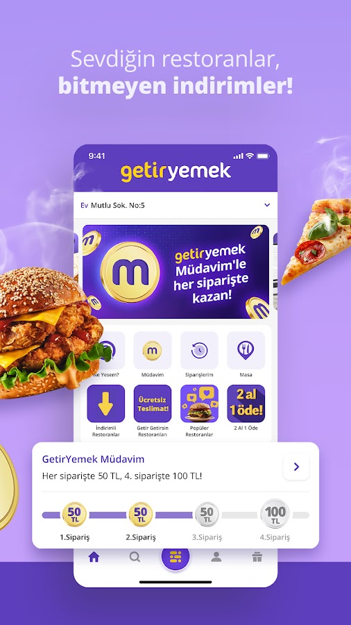 Обрабатывайте онлайн-покупки продуктов, заказы еды, финансовые транзакции и все ваши потребности за считанные минуты благодаря технологической мощи Getir! Легко удовлетворяйте все ваши потребности: от ресторанов до магазинов, от воды до закусок, от покупок до кредитов.