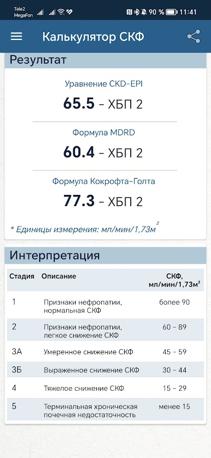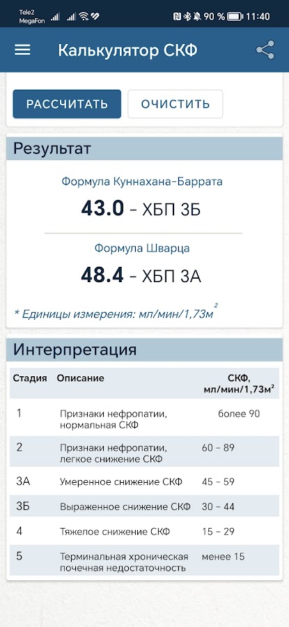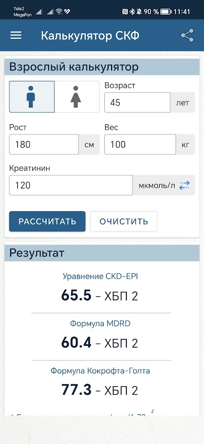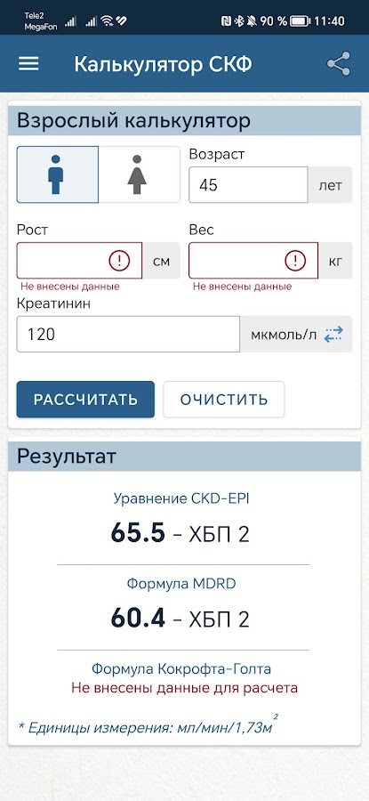 Представленный калькулятор производит расчет по формулам Кокрофта-Голта, MDRD и уравнению CKD-EPI. Расчет СКФ у детей производится по формуле Шварца и Куннахана-Баррата.